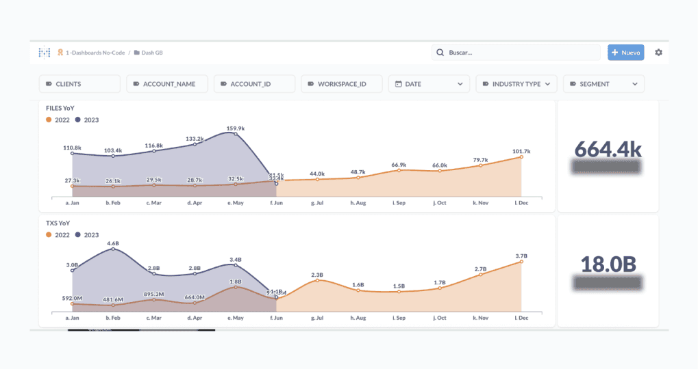 Users can’t analyze the data because the dashboards don’t have global filters. Some dashboards have many charts where they analyze the status of their processes, and not having a main filter to select only what they want to see is a huge problem, the other issue appears when dealing with millions and millions of data.